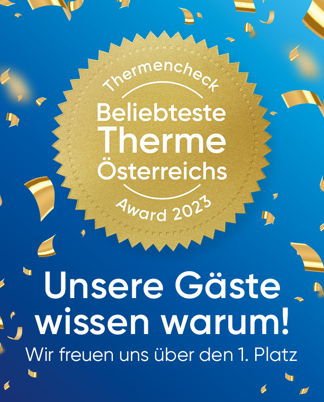 Wir sind überglücklich, sehr stolz und überaus dankbar Platz 1 von 40 zur Wahl stehenden Thermen in Österreich sein zu dürfen. DANKE!